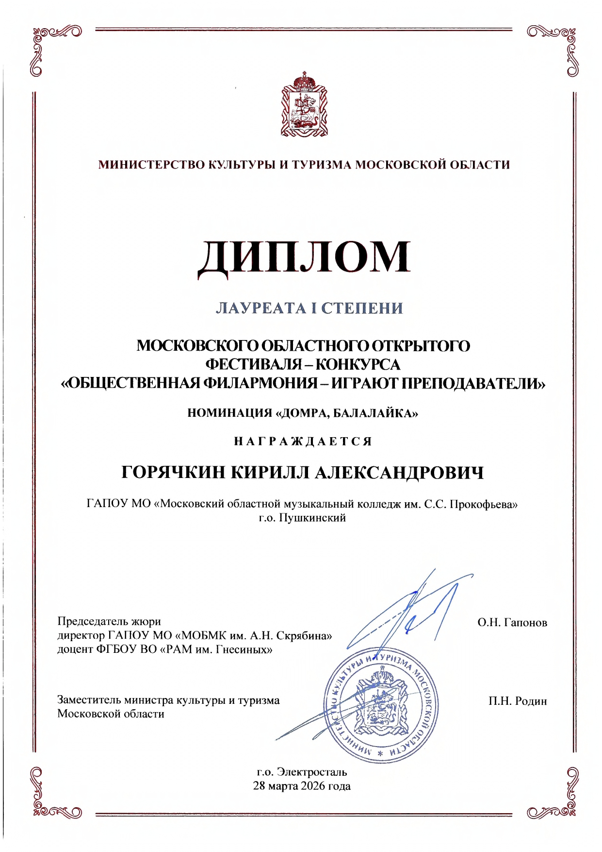 После нескольких лет перерыва наш колледж был вновь представлен в этом значимом областном мероприятии - преподаватель Кирилл Александрович Горячкин принял участие в номинации "Балалайка/домра соло" и стал Лауреатом I премии!