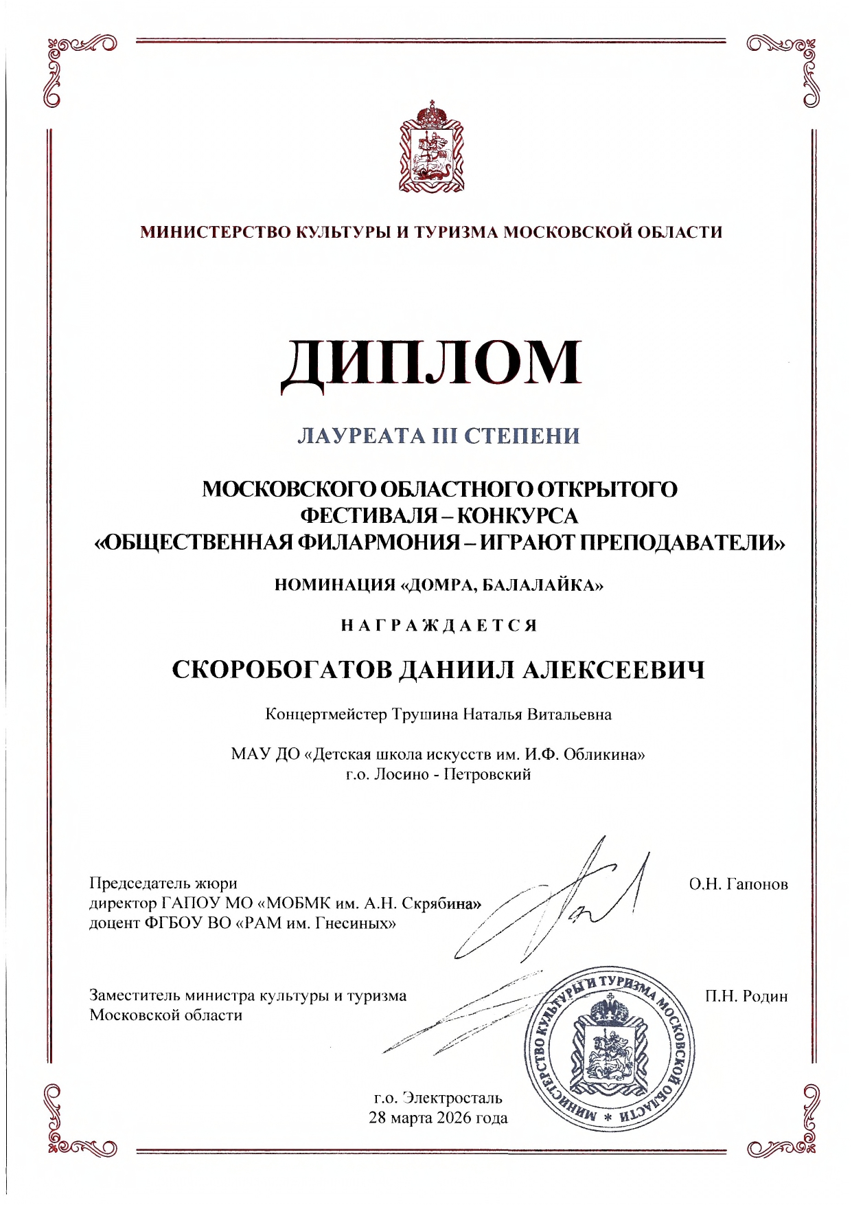 Также отрадно, что Лауреатом III степени в той же номинации стал выпускник колледжа, ныне преподаватель ДШИ имени И.Ф.Обликина Даниил Скоробогатов!