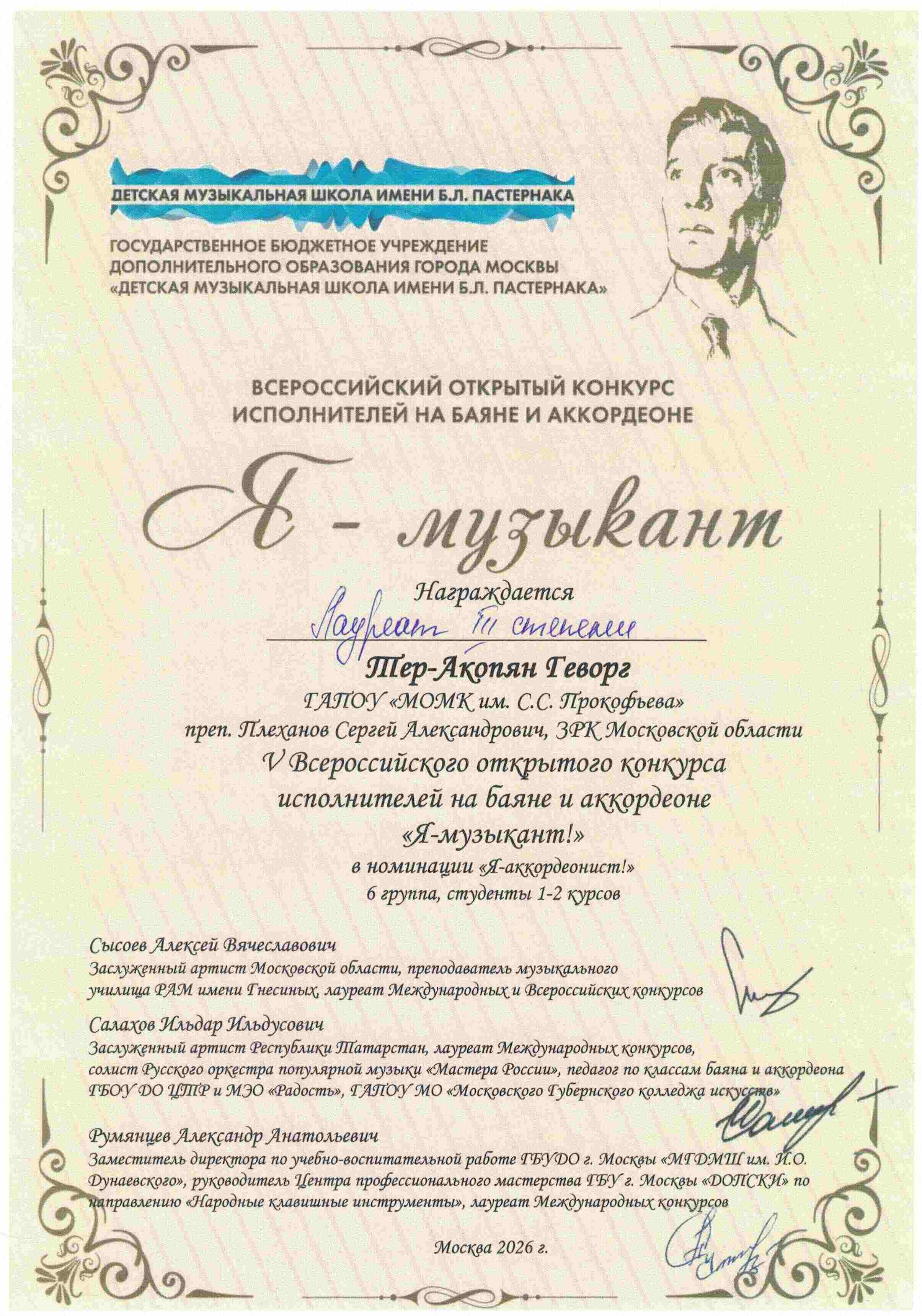 Геворг Тер-Акопян занял почётное место Лауреата III степени.
