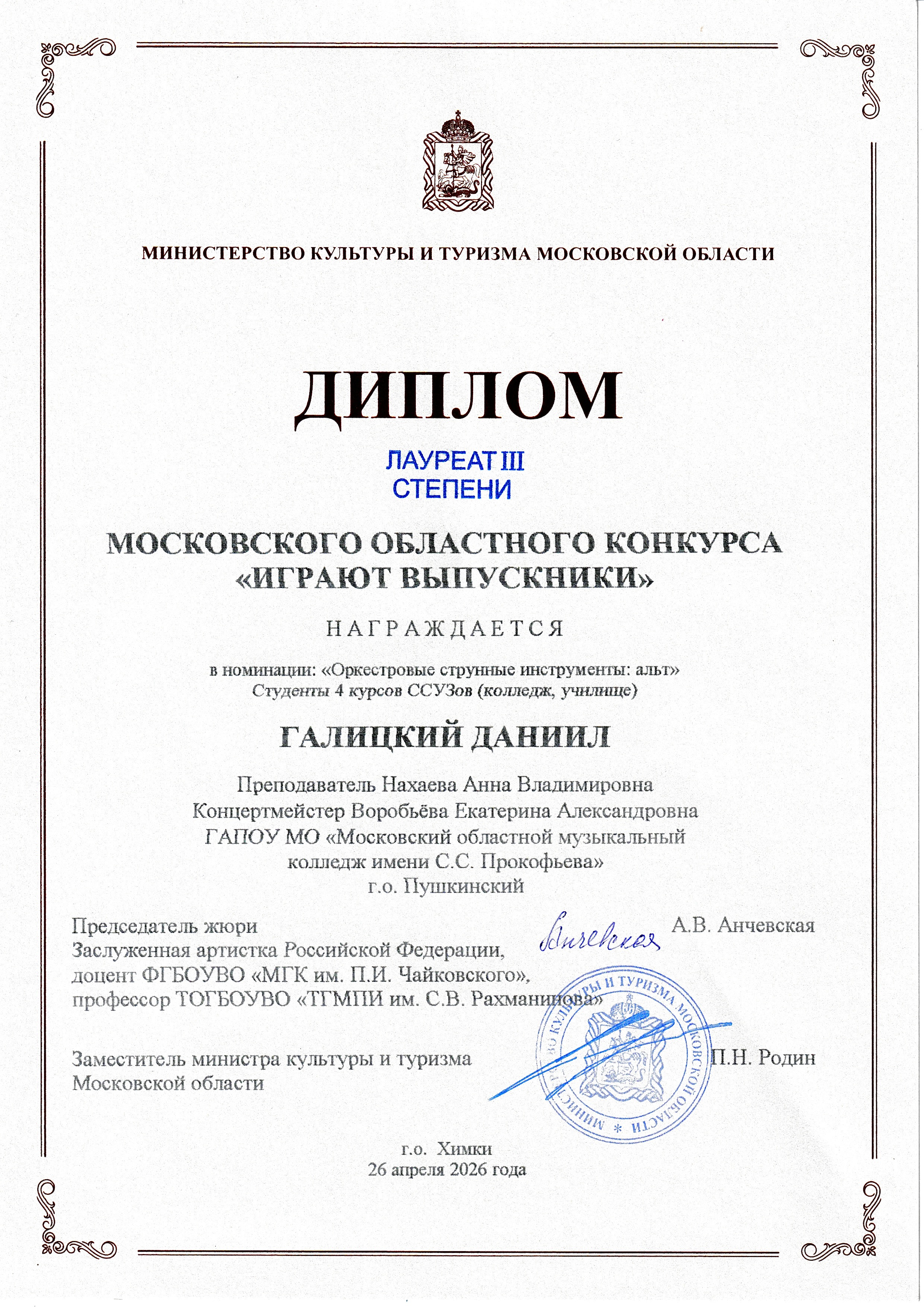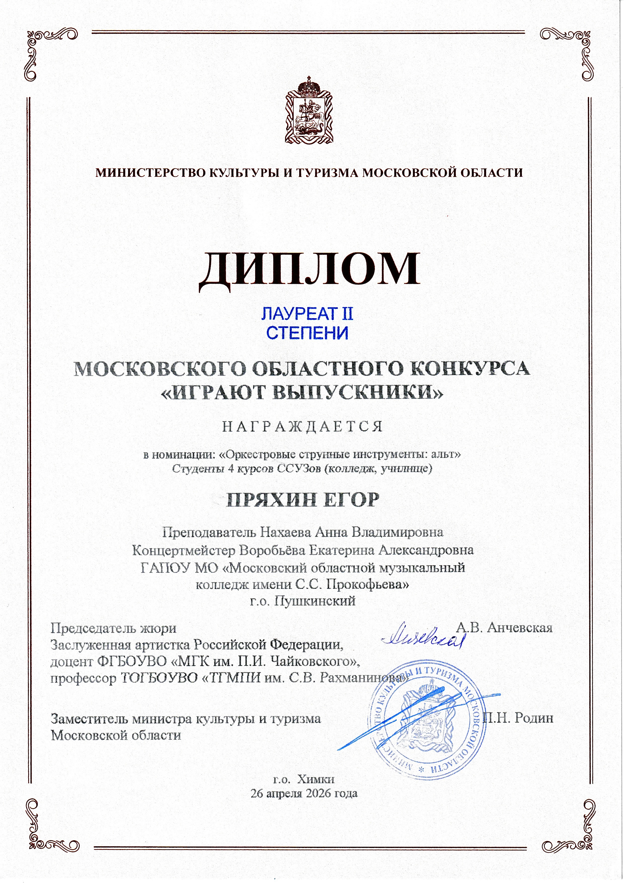 Николай Пургин (скрипка) стал лауреатом I степени, Анна Пургина (скрипка) и Егор Пряхин (альт) — лауреатами II степени, Даниил Галицкий (альт) - лауреатом III степени.
