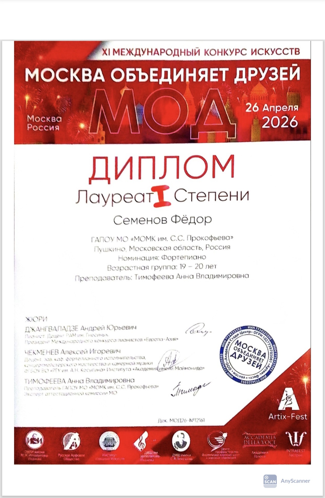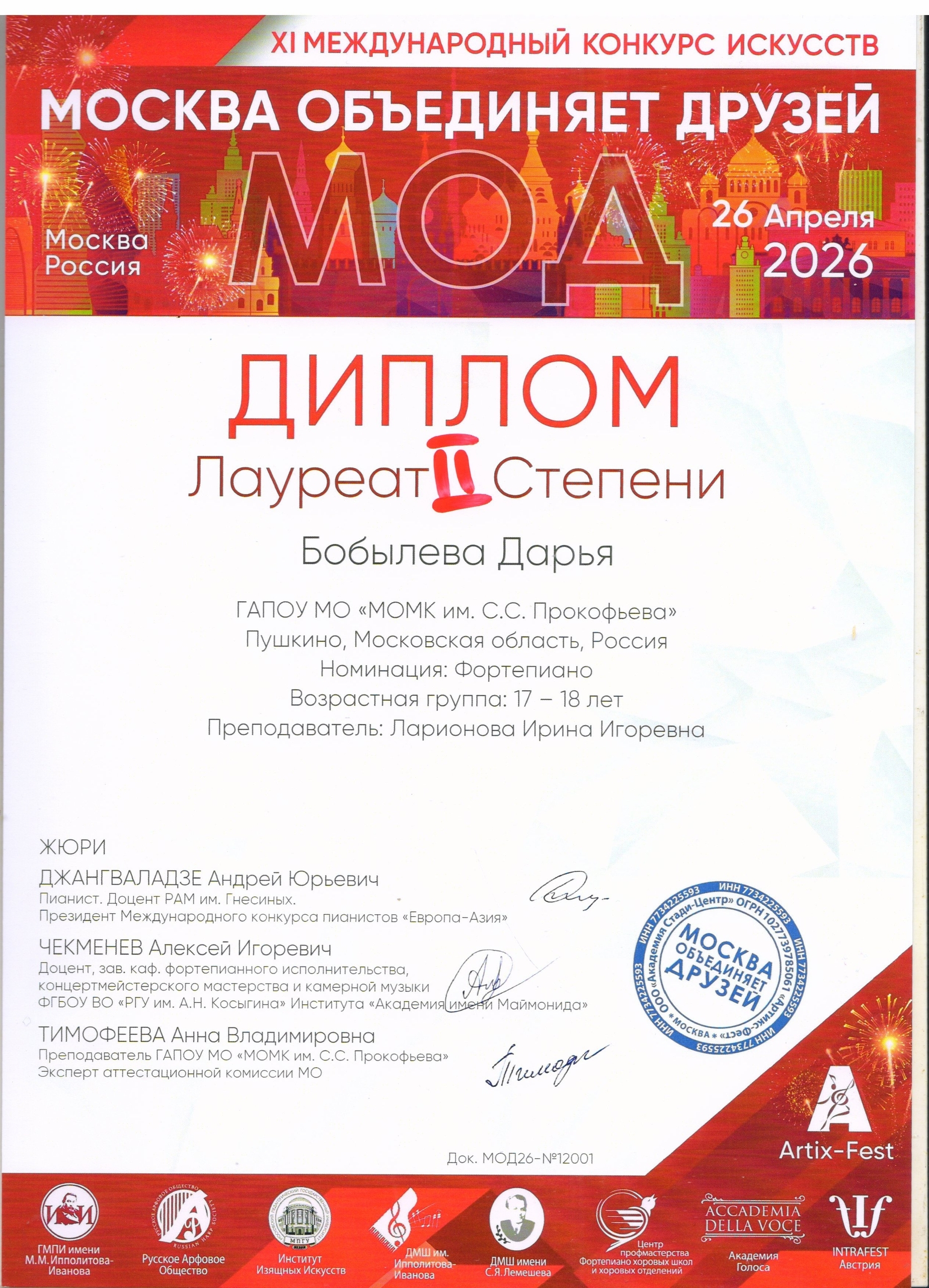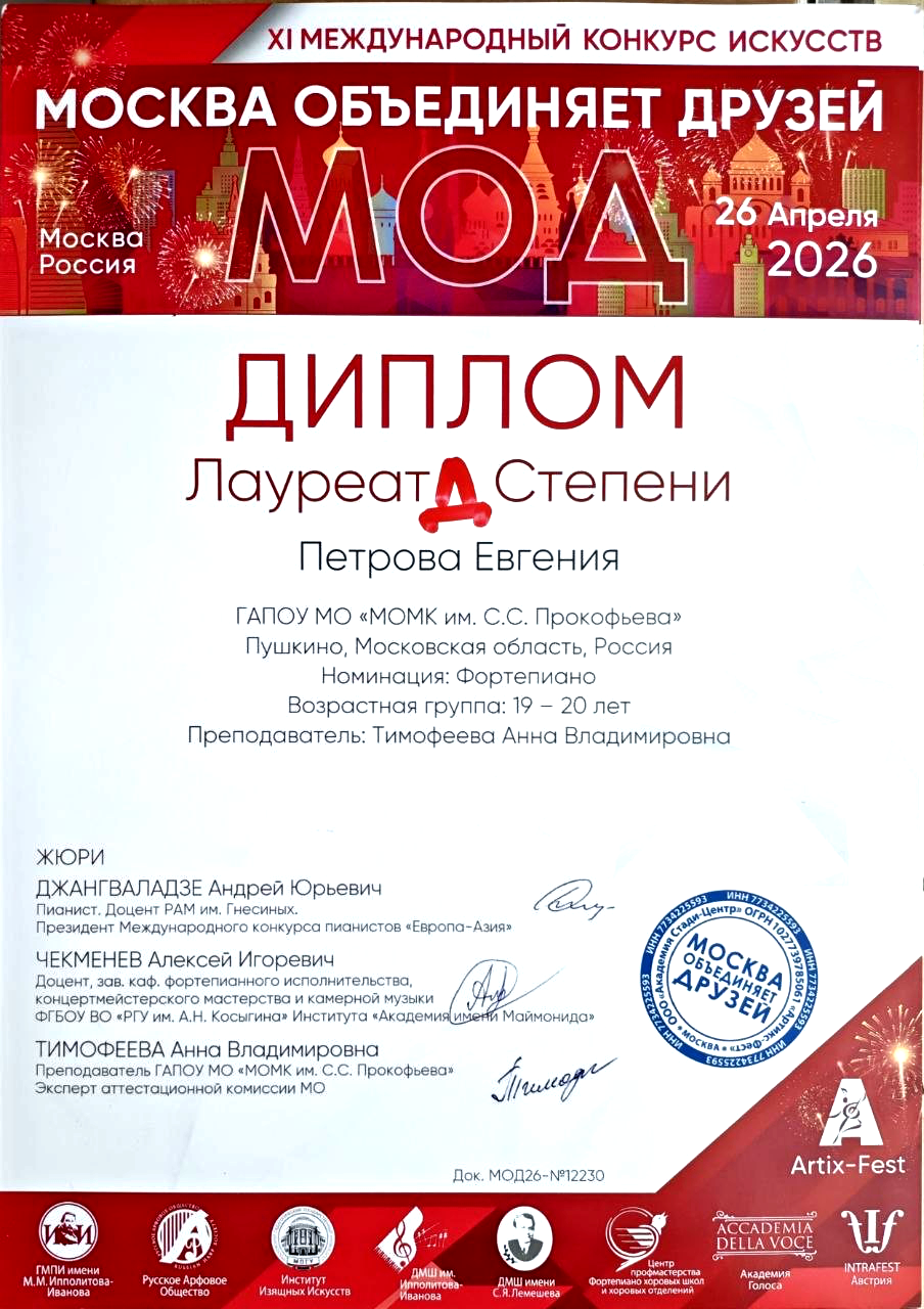 26 апреля в Государственном музыкально-педагогическом институте имени М.М. Ипполитова-Иванова состоялся Международный фестиваль-конкурс искусств, объединивший юных музыкантов из разных городов. Студенты фортепианного отделения нашего колледжа (всех курсов) приняли активное участие в конкурсной программе и показали впечатляющие результаты, завоевав звания лауреатов и дипломантов в нескольких возрастных категориях.