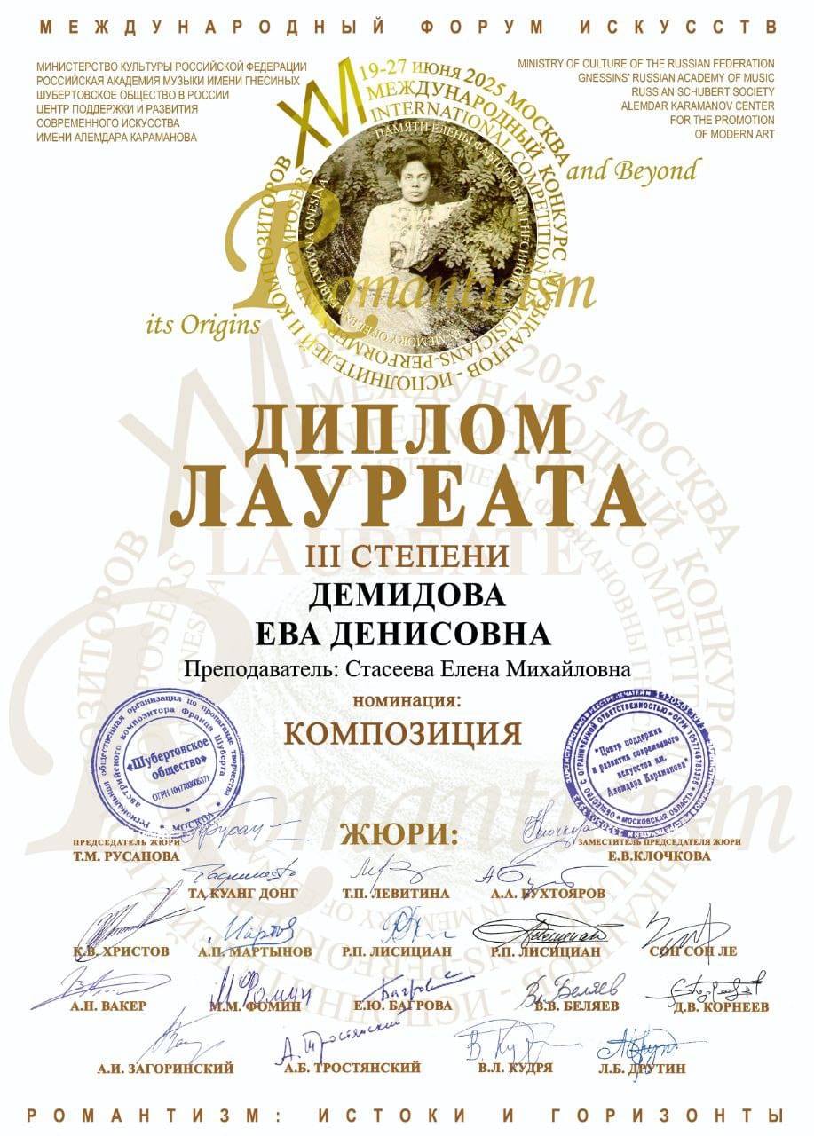В конце июня в Москве состоялся XVI Международный конкурс музыкантов-исполнителей и композиторов: "Романтизм: истоки и горизонты", памяти Е.Ф.Гнесиной.