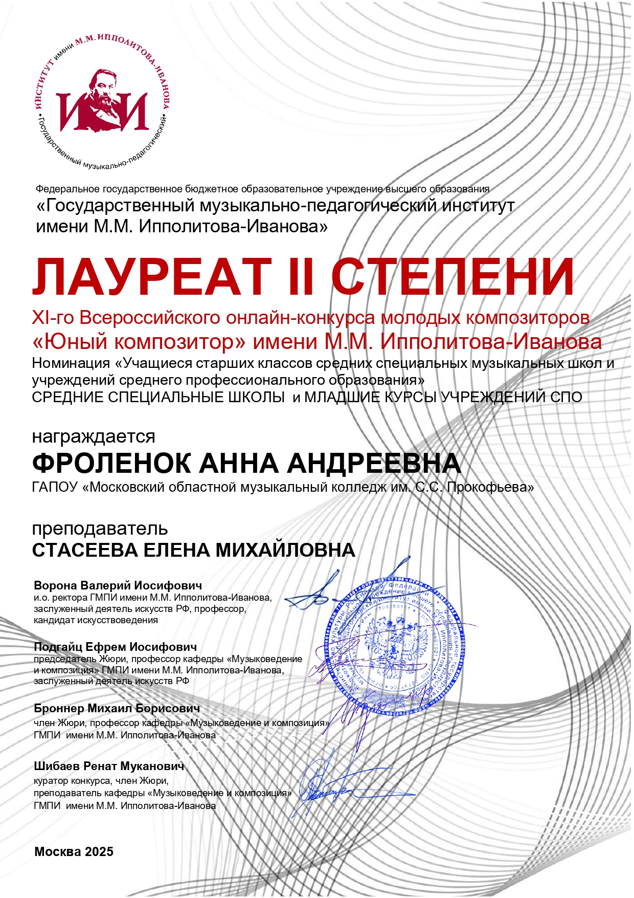 В этом творческом состязании регулярно принимают участие студенты фортепианного отделения нашего колледжа и радуют нас успешными выступлениями. Не подвели ребята и на этот раз. Творческий десант студентов младших курсов занял весь пьедестал: Матвей Финкель, как и в прошлом году, был удостоен звания лауреата I степени, Кирилл Постиженко и Анна Фролёнок стали лауреатами II степени, Дарья Воробьёва — III. В старшей возрастной группе Ева Демидова награждена дипломом лауреата II степени.