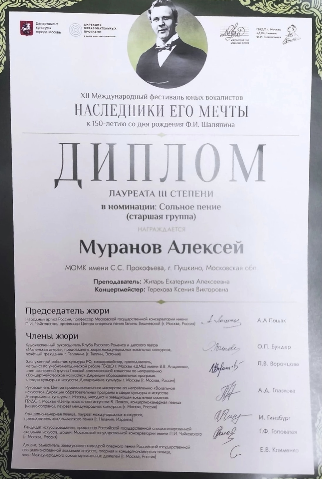 Поздравляем студента III курса специальности «Вокальное искусство» Алексея Муранова (класс заслуженной артистки Московской области Екатерины Житарь, концертмейстер Ксения Терехова), ставшего Лауреатом III степени XII Международного фестиваля юных вокалистов «НАСЛЕДНИКИ ЕГО МЕЧТЫ», посвящённого 150-летию со дня рождения Ф.И. Шаляпина!