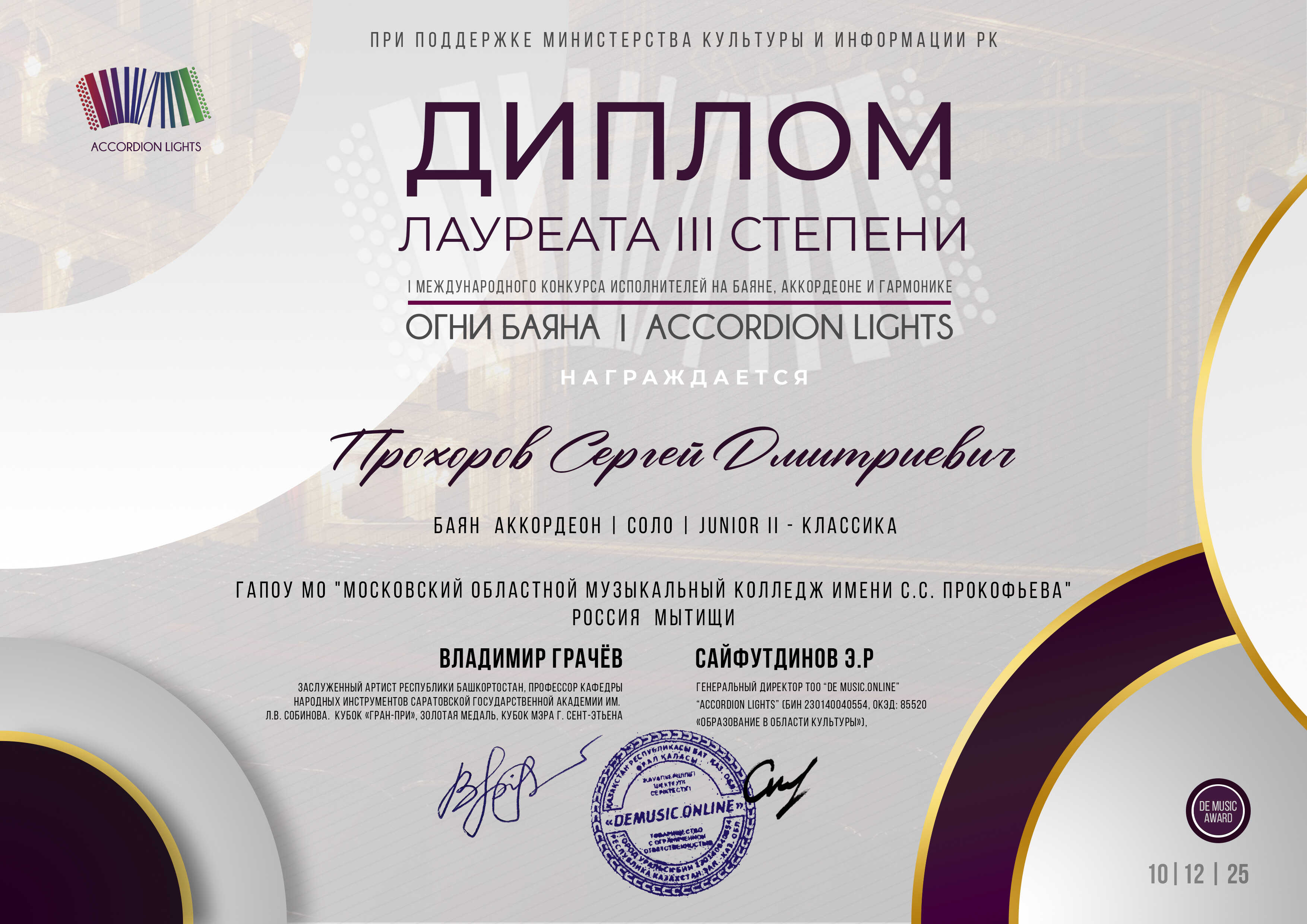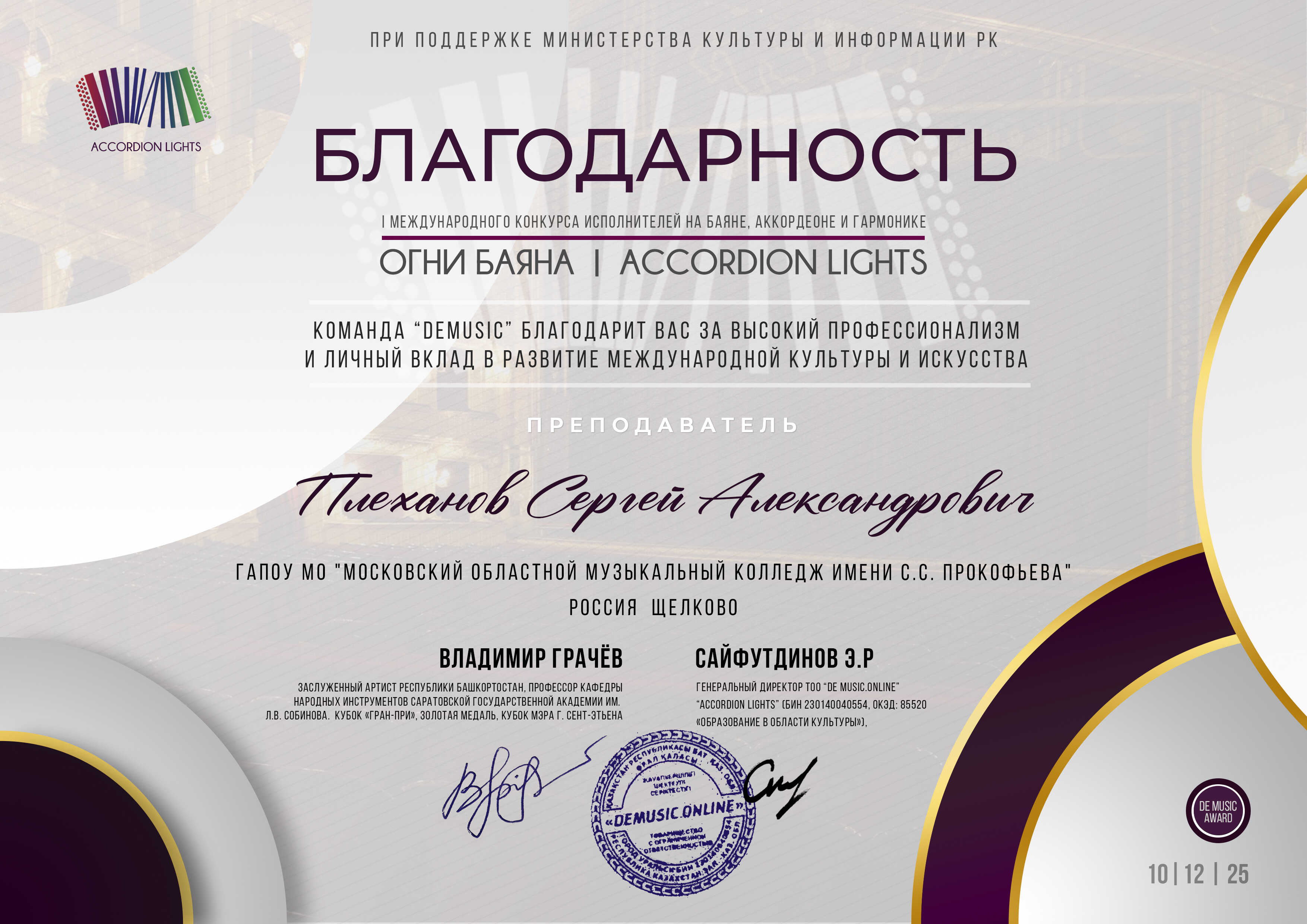 В декабре прошёл I Международный конкурс исполнителей на баяне, аккордеоне и гармони «Огни Баяна | Accordion lights». Несмотря на то, что конкурс проводился впервые, на нём выступили баянисты и аккордеонисты из Беларуси, Казахстана, Азербайджана, России и Словакии. Только из нашей необъятной Родины участие приняли более 230 артистов — от западных границ Калининградской области до восточных берегов Камчатки.