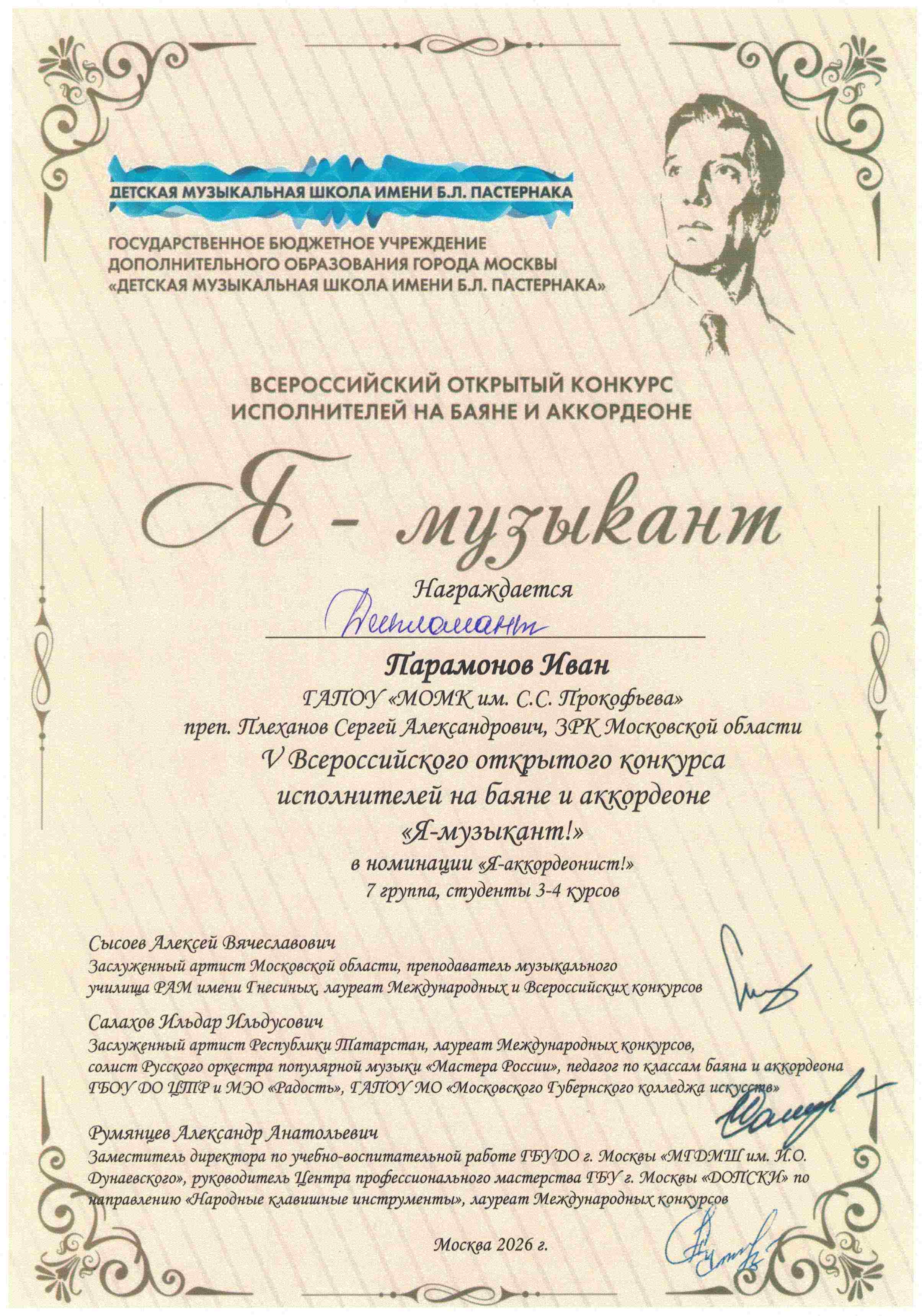 Иван Парамонов также продемонстрировал свой высокий исполнительский потенциал и получил звание Дипломанта.