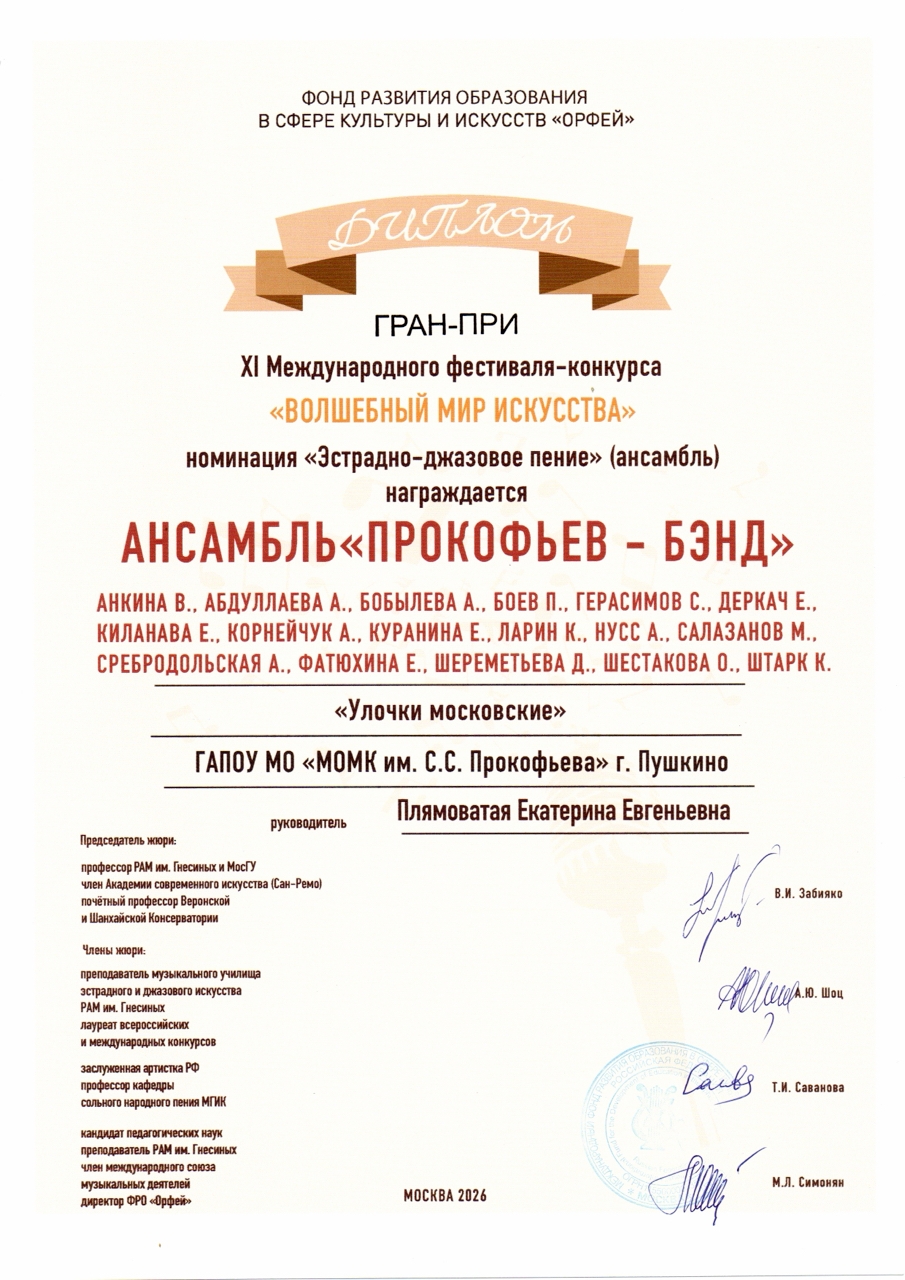 Поздравляем вокальный ансамбль «Прокофьев-Бэнд» (руководитель Екатерина Плямоватая) с дипломом Гран При XI Международного фестиваля-конкурса «Волшебный мир искусства» в заочной форме номинации «Эстрадно-джазовое пение (ансамбль)» Желаем новых творческих побед и вдохновения!