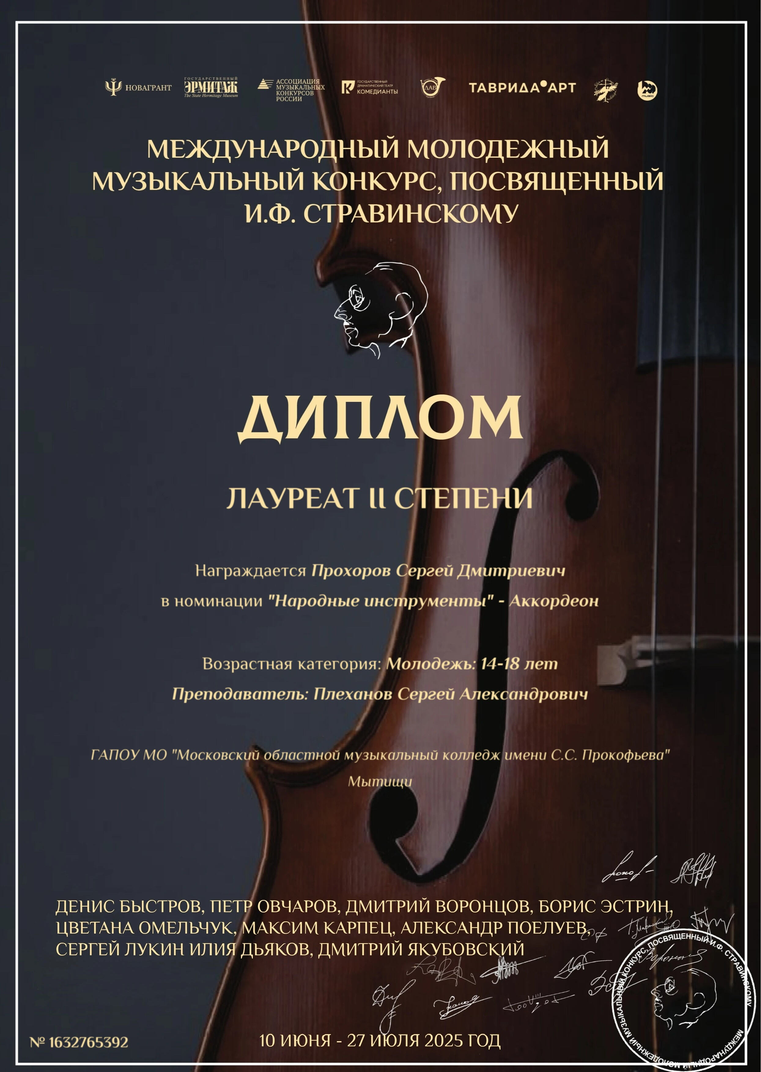 Лауреат II степени в категории «Народные инструменты – аккордеон»