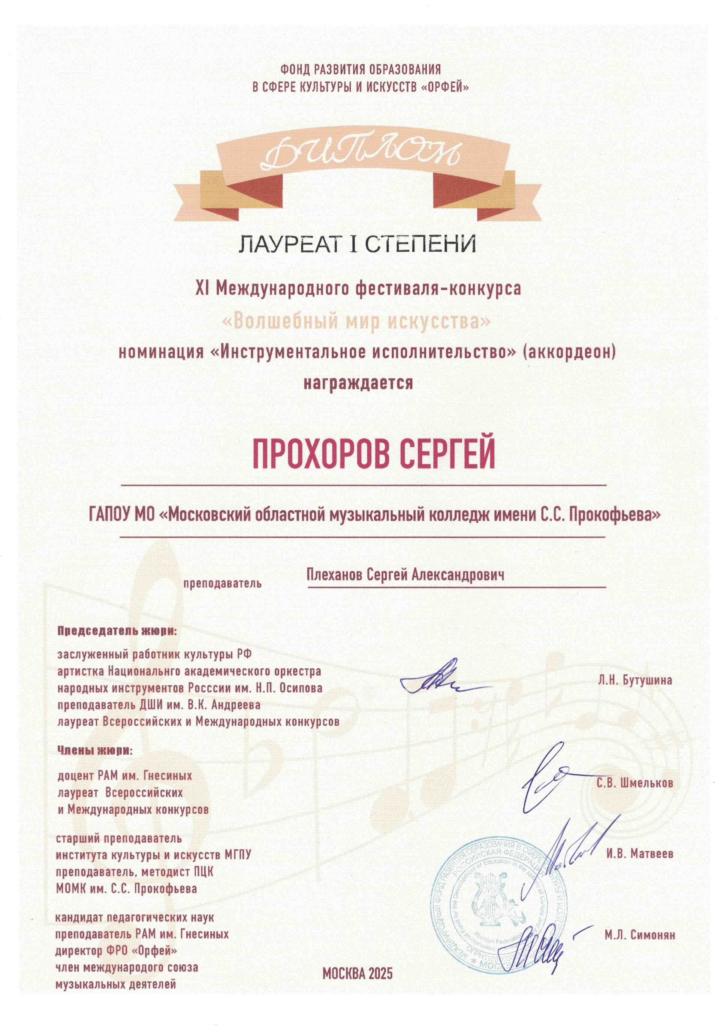 Мы гордимся тем, что студенты класса Сергея Александровича Плеханова, участвовавшие в этом конкурсе, показали высокие результаты и продемонстрировали свой талант. Сергей Прохоров стал настоящим триумфатором, завоевав звание Лауреата I степени сразу в двух номинациях: «Инструментальное исполнительство (аккордеон)» и «Искусство дирижирования». Эта победа – заслуженный результат его упорного труда и преданности музыке.
