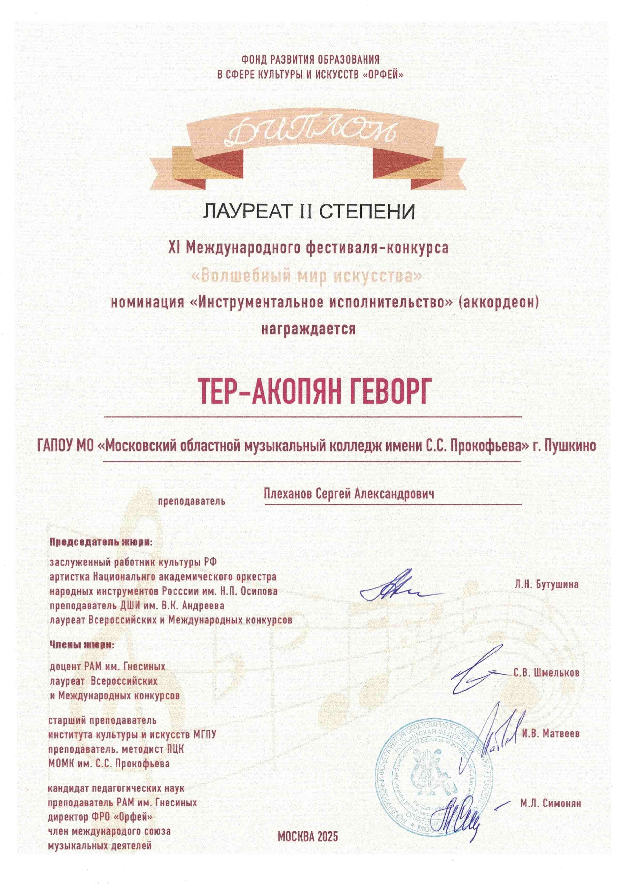 Геворг Тер-Акопян также продемонстрировал высокий уровень исполнительского мастерства, став Лауреатом II степени в номинации «Инструментальное исполнительство (аккордеон)». Его выступление отличалось виртуозностью и артистизмом, оставив яркое впечатление у публики.