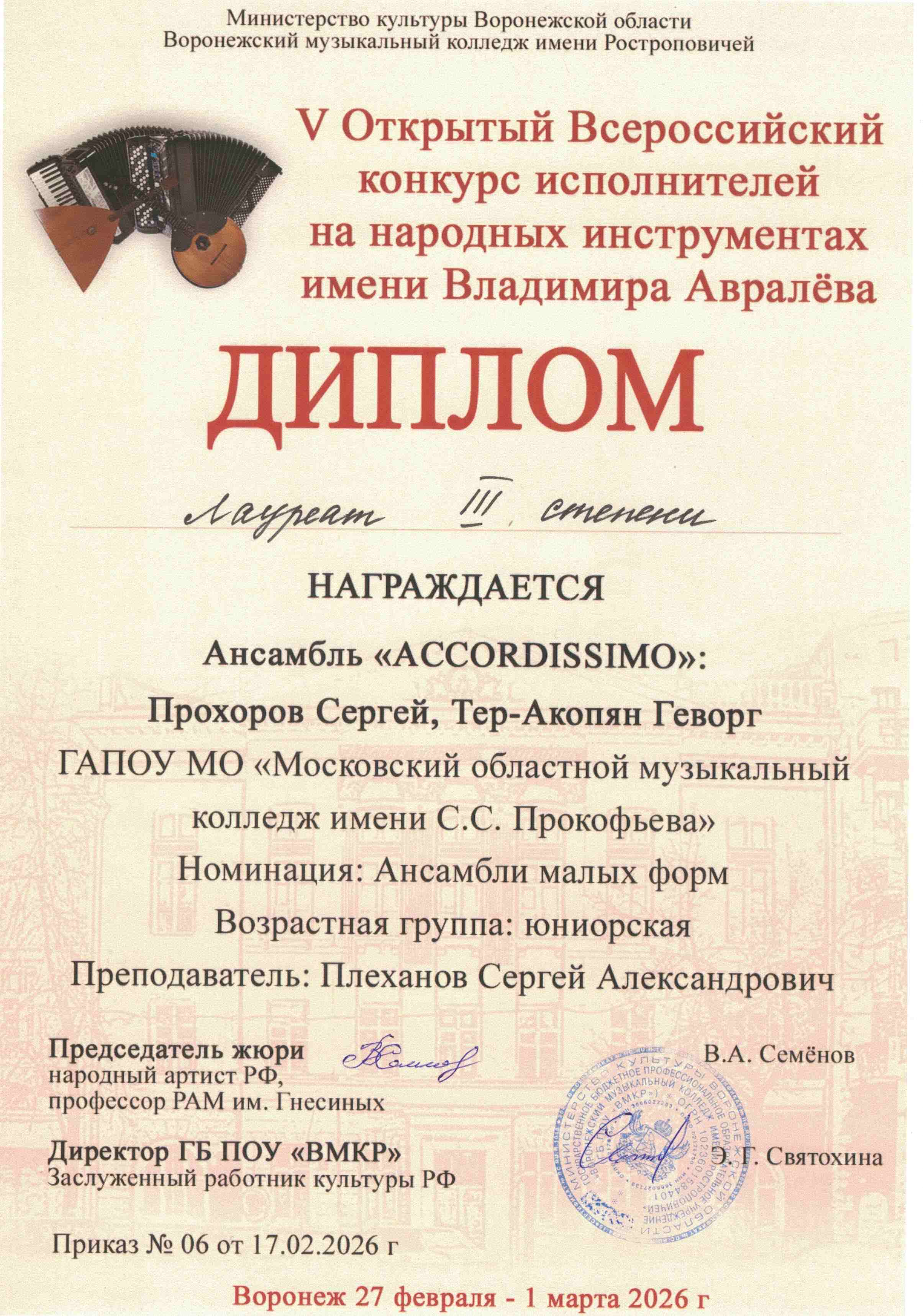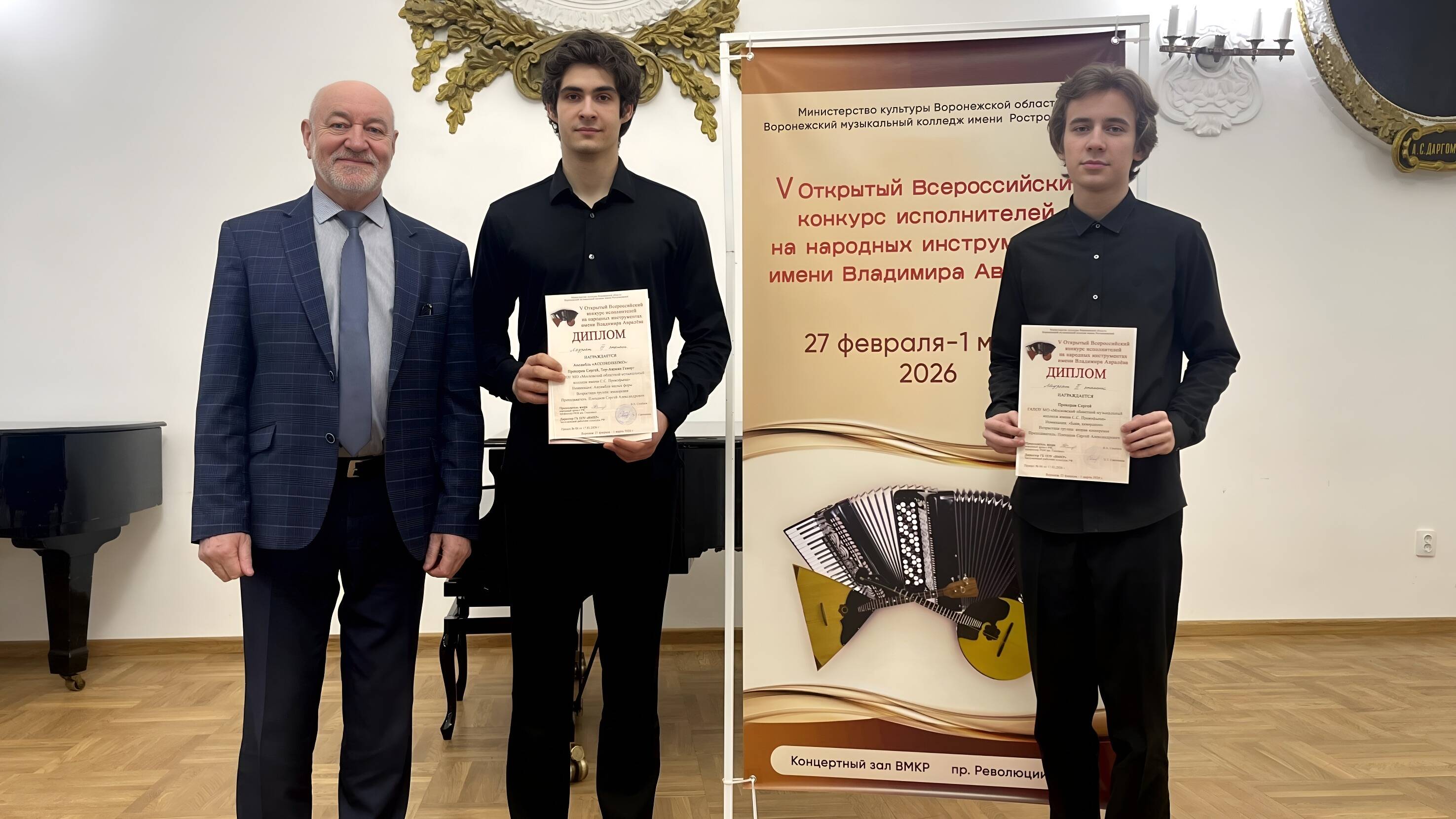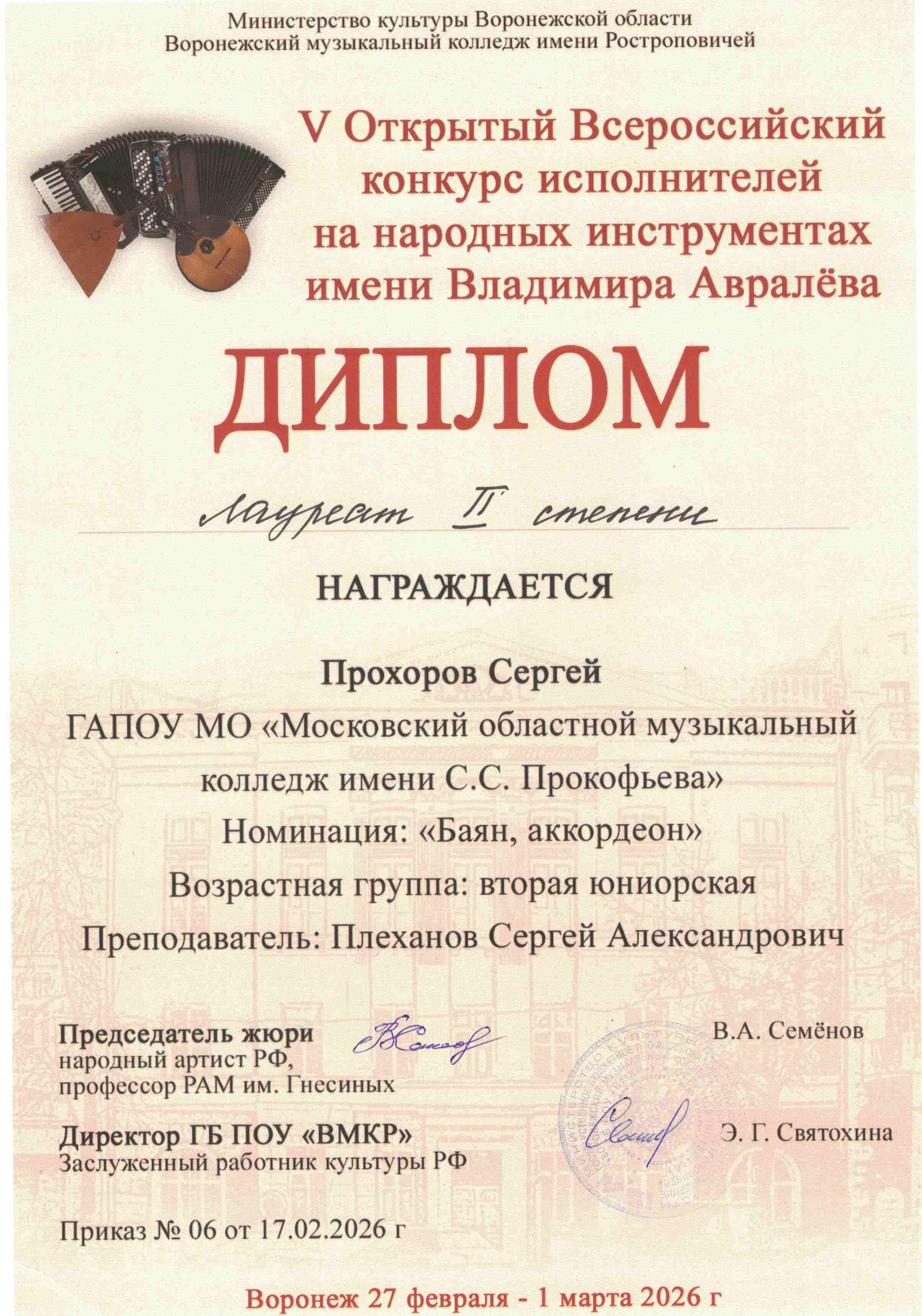 Сергей Прохоров, один из моих наиболее одарённых и талантливых воспитанников Сергея Александровича, достиг выдающегося результата, завоевав звание Лауреата II степени. Примечательно, что в данной категории Диплом I степени не был вручен никому, что придает успеху Сергея еще большую значимость. Ансамбль «Accordissimo», участниками которого стали Сергей Прохоров и Геворг Тер-Акопян, также был удостоен награды, став Лауреатом III степени. Геворг Тер-Акопян был отмечен как Дипломант конкурса, что говорит о его значительном потенциале и перспективах развития.