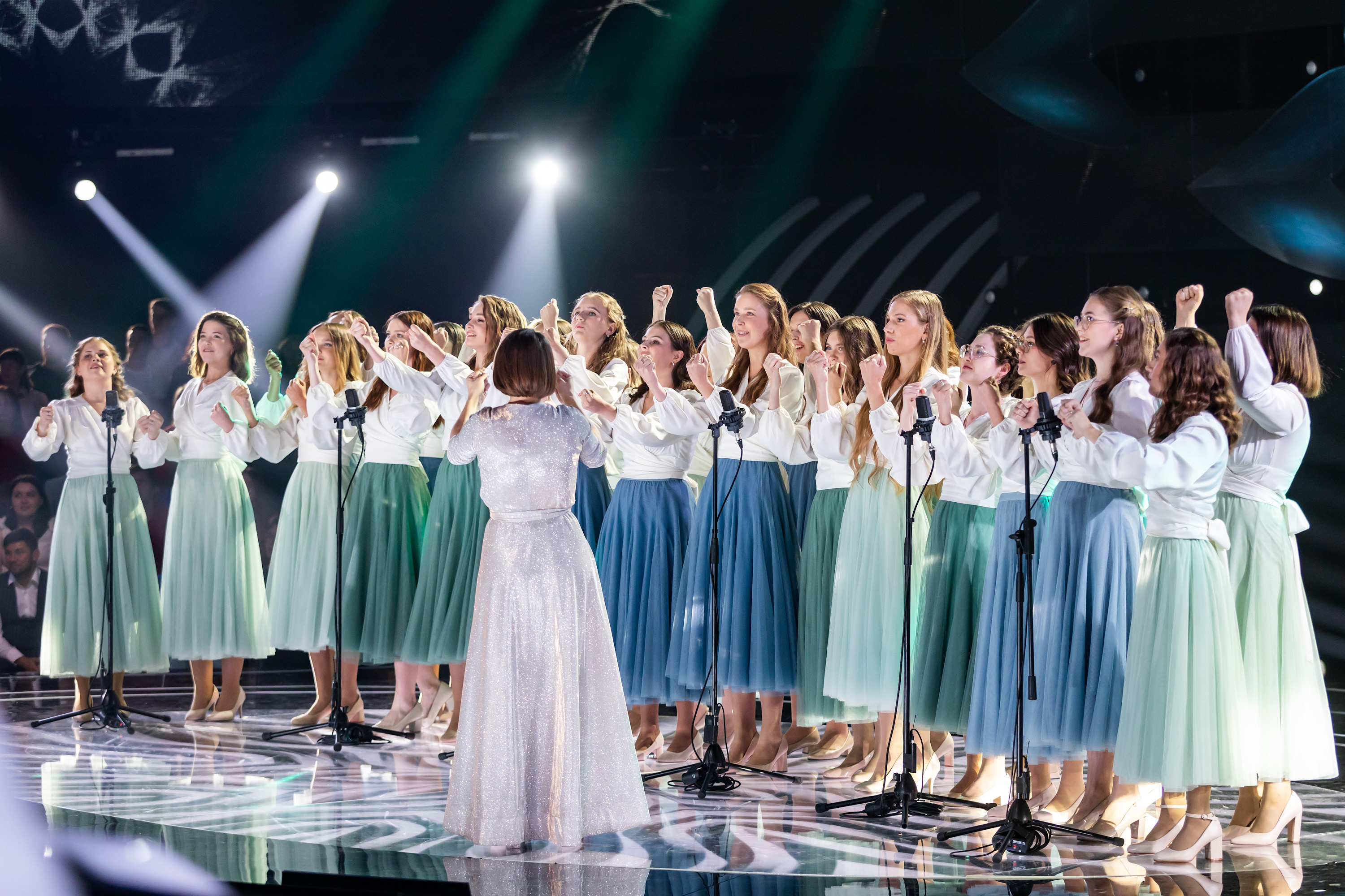 Руководитель хора — Ирина Олеговна Устьянцева проделала огромный труд для такого фееричного выступления. Каждая участница хора по мановению её руки засияла как яркая звезда.